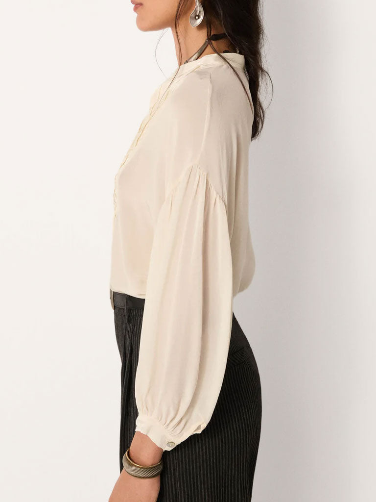 At the front, a pleated bib adds just the right touch of structure, while delicate lace-like detail lends a whisper of romance. Tailored yet poetic, this blouse walks the line perfectly for dressing up or dressing unexpectedly.