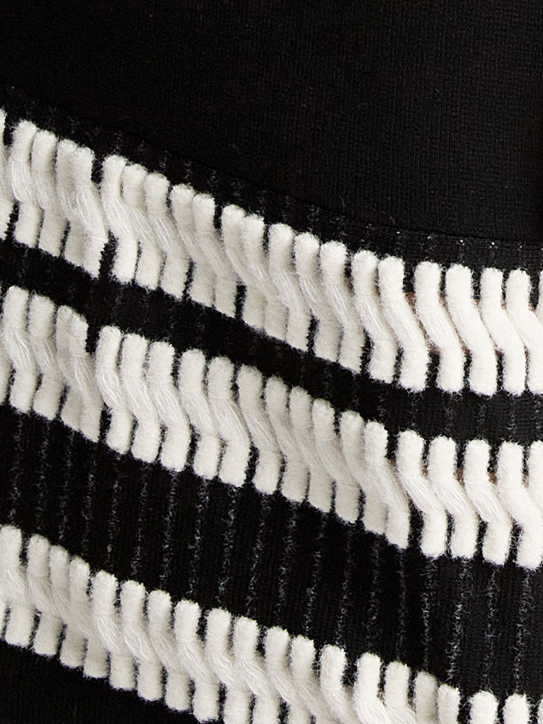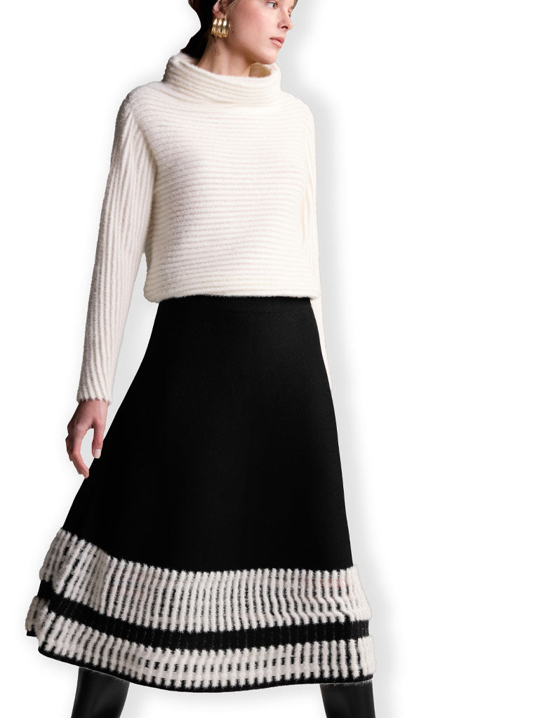Elegant, refined, and beautifully crafted, the Concerto Knit Midi Skirt by Maria Pavan captures the artistry of premium knitwear. In a flattering A-line silhouette, it flows from the flat elastic waistline to mid-calf, finishing with a double row of cream openwork above a black hem — adding textural intrigue and a subtle nod to festive sophistication.