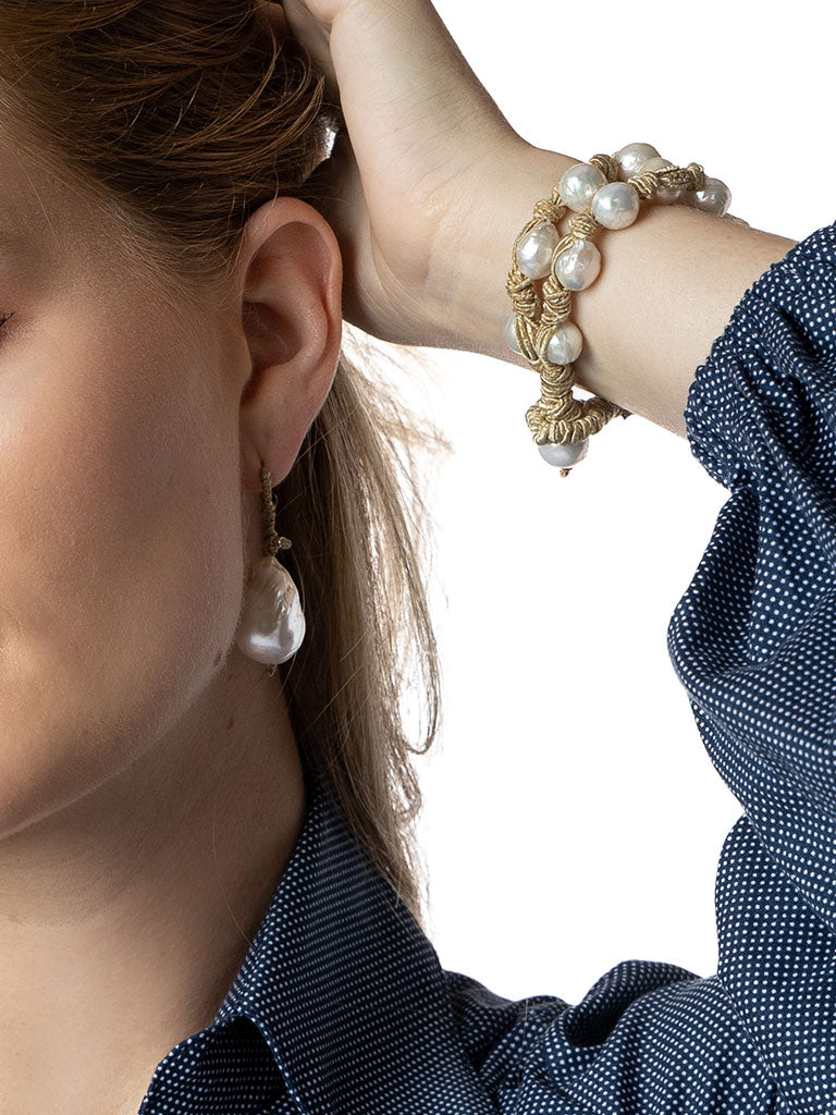 One of our bestsellers is the stunning double-stranded Pisco Punch Baroque Pearl Bracelet, exuding elegance with a hint of Bohemian. Each baroque pearl (hand selected from the South Seas for its luster, size and shape) is designed and handmade in Italy by MELA. The term 'baroque' originates from the Portuguese word for imperfect —'barocco,' so each bracelet will be one-of-kind. Choose from white or lavender-pink pearls strung on bronze linen and silk cording with a pearl-loop closure.