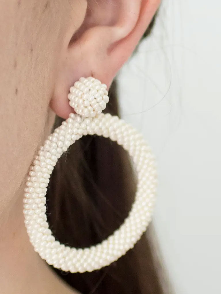 An elegant twist on the Classic Hoop. These hand-beaded beauties are made by female artisans in Nepal using high quality glass beads and hand-dyed cotton thread. Available in white, ivory and three shades of blue—midnight, indigo and Seabreeze.